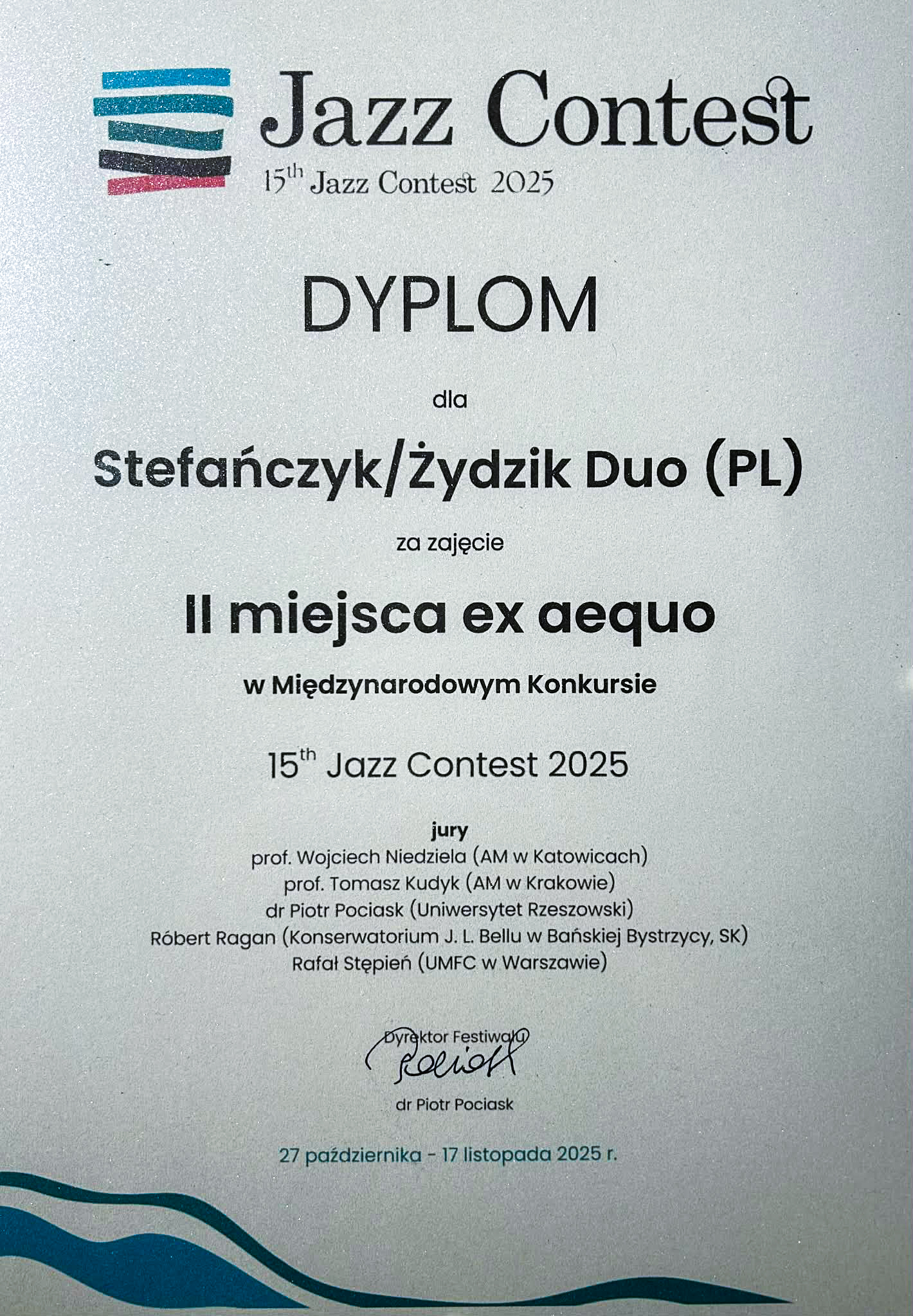Gratulacje dla duetu Przemysław Stefańczyk (fortepian), Dominik Żydzik (gitara) za zajęcie II miejsca w Międzynarodowym Konkursie 15th Jazz Contest 2025!