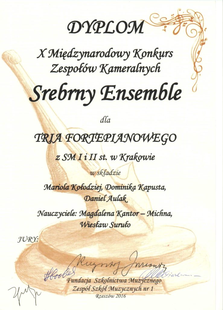 7 kwietnia 2017 podczas II etapu Ogólnopolskiego Konkursu Centrum Edukacji Artystycznej w Warszawie w przesłuchaniach zespołów jazzowych brał udział zespół przygotowany przez p. Gabriela Niedzielę. Zespół w składzie: Szymon Paciora (trąbka), Marcin Konieczkowicz (saksofon altowy), Paweł