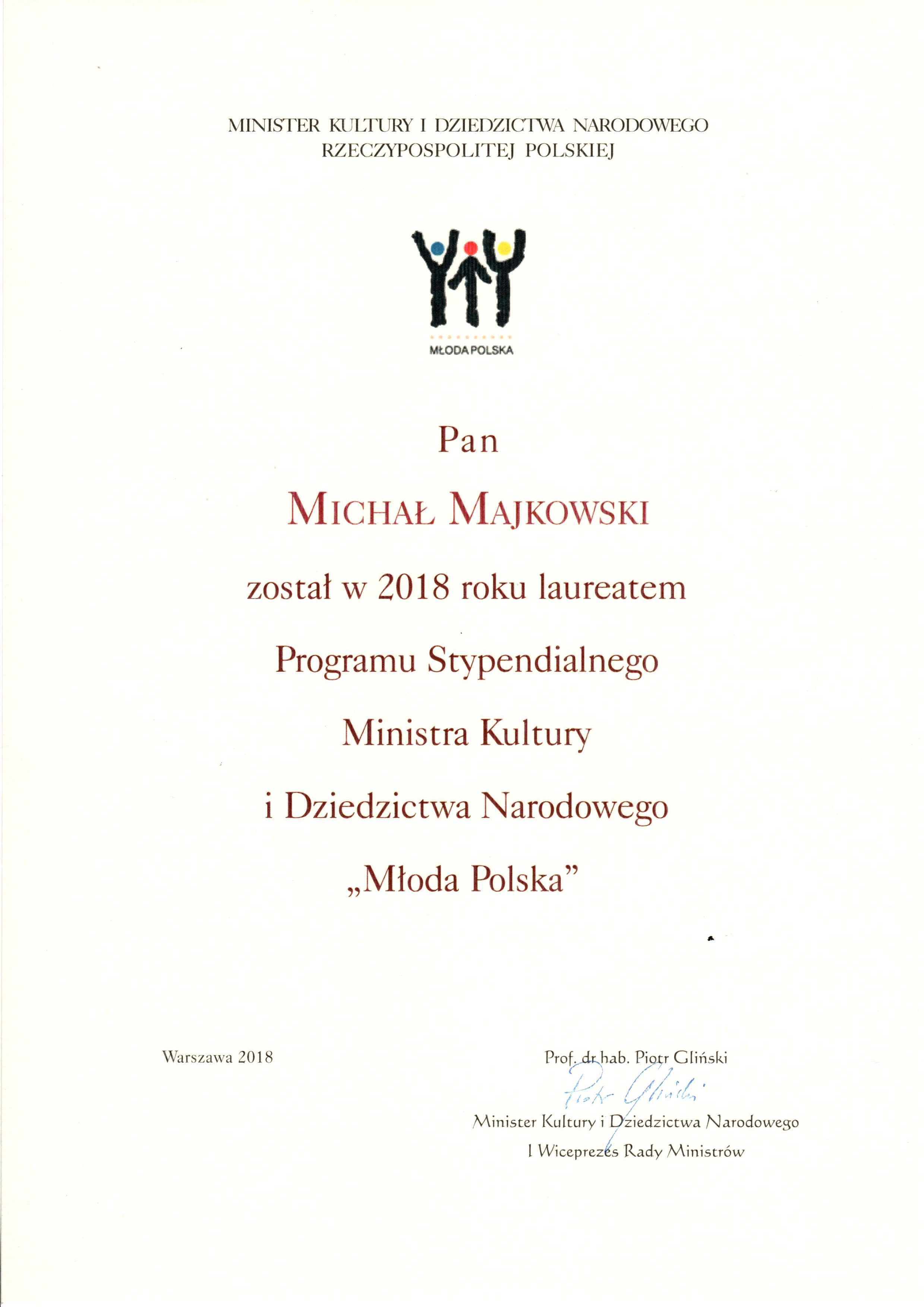 Michał Majkowski uczeń z klasy harfy p. Agnieszki Greli – Fedkowicz został laureatem programu stypendialnego Ministerstwa Kultury i Dziedzictwa Narodowego „Młoda Polska”. Program przeznaczony jest dla młodych artystów, którzy wykazali się wybitnymi osiągnięciami.